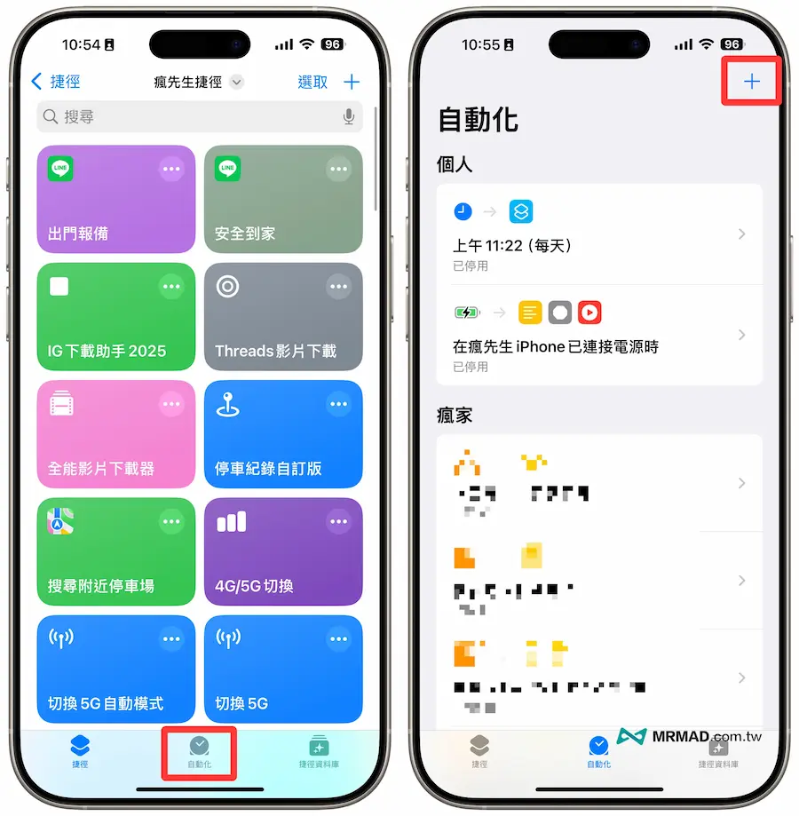 切換捷徑APP工具列「自動化」頁面,按下右上角「+」;如果先前都沒設定過捷徑自動化,就按下「製作個人自動化操作」。