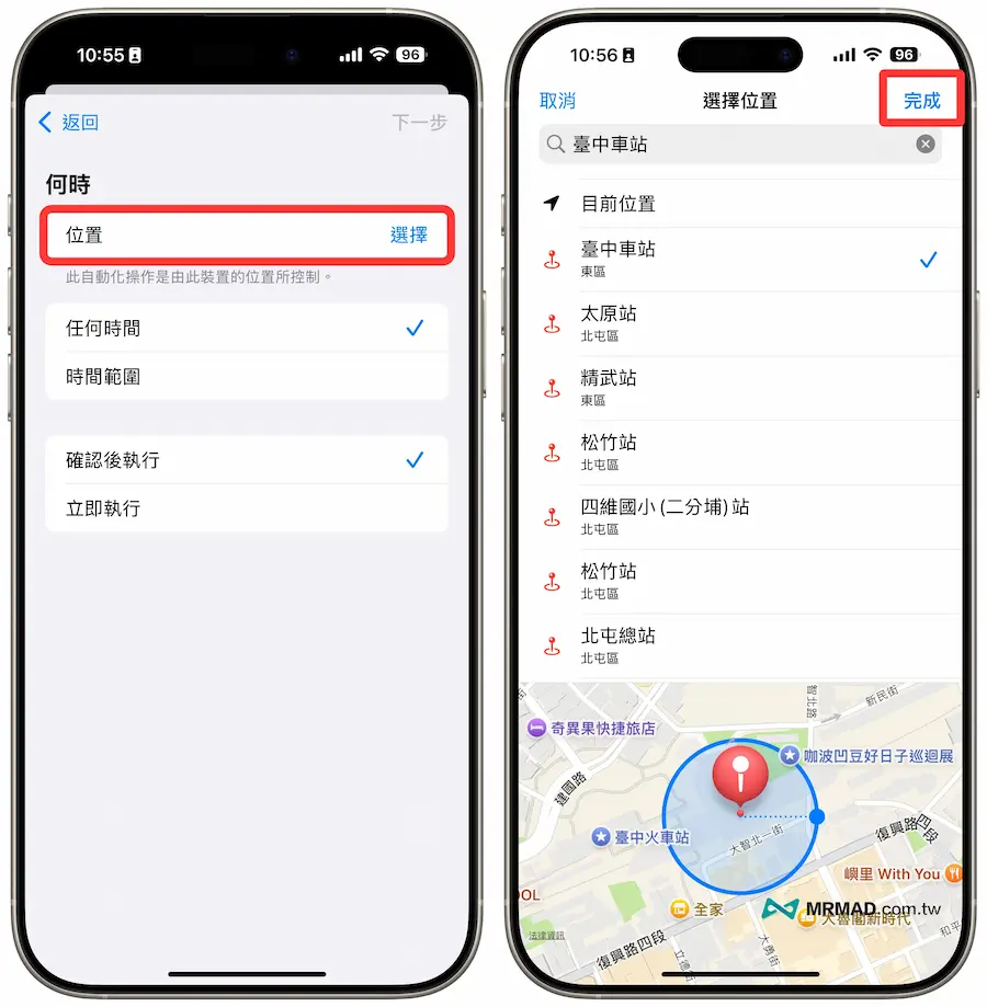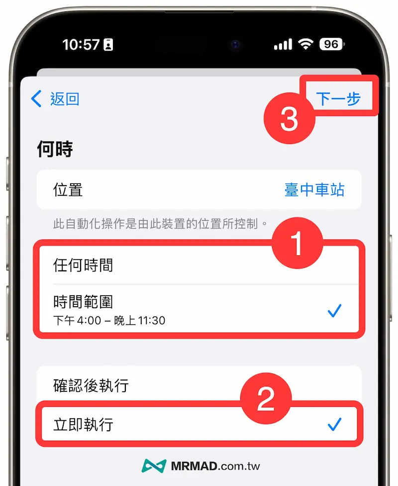 底下能夠自訂每天讓捷徑腳本自動執行時間範圍,像是到家時間大概都是下午5點後或晚上,就自訂時間區間,最後面要改成「立即執行」,就不需要將iPhone解鎖狀態,才能實現完全自動化 LINE 傳送訊息