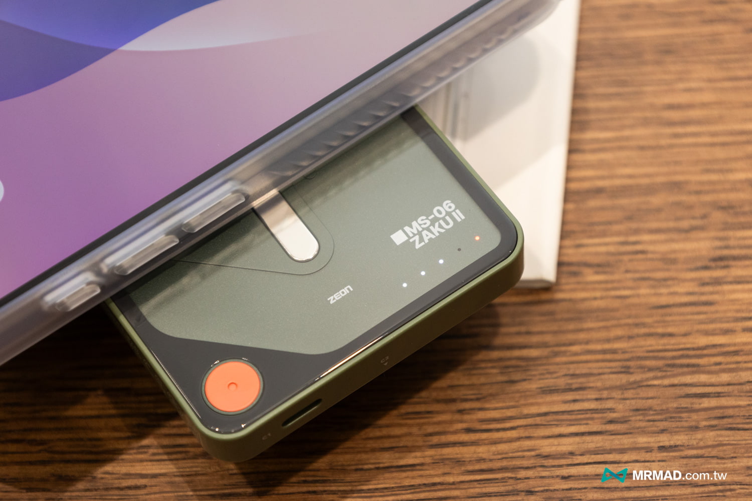除了顏色和圖案設計外,Momax MOMAX 1-Power X Pro 行動電源正面也採用獨特的鏡面透視設計,可以看到行動電源內部的精密零件結構,同時底色和電源鍵也隨機身呈現協調的對比色調,如果是鋼彈款也會有機動戰士型號標示,算是目前市面上做的最精美行動電源。
