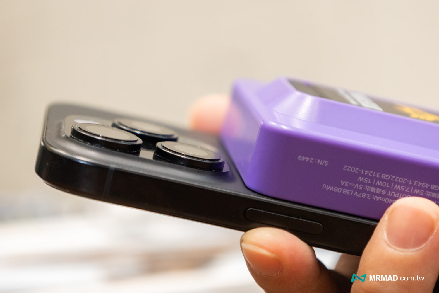 就算有裝 iPhone 保護殼,有些保護殼會將鏡頭框設計兩層強化保護,雖然稍微會造成卡邊緣,但也不太會影響 MOMAX 1-Power X Pro 磁吸充電,就手邊測試多款不同品牌的保護殼在磁吸搭配也超緊。
