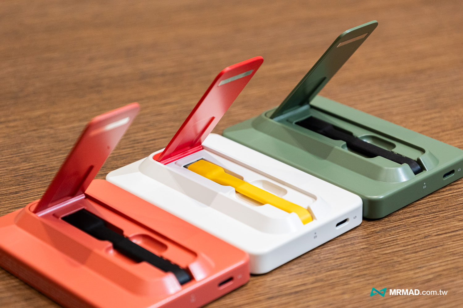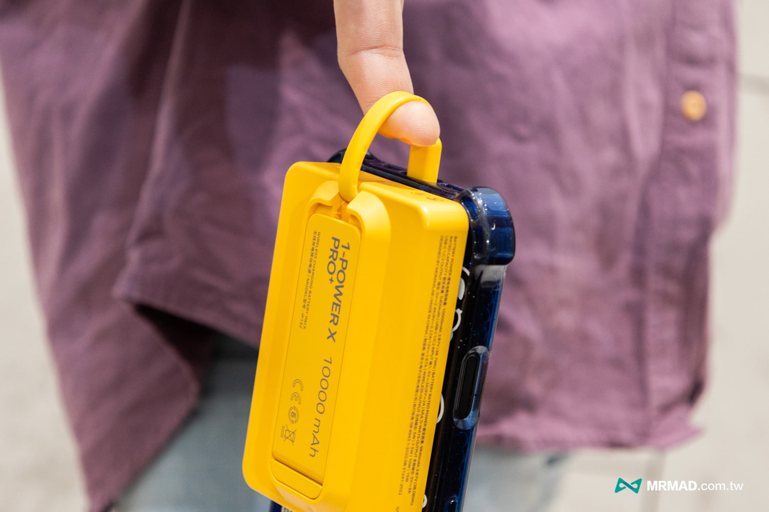 在 MOMAX 1-Power X Pro 行動電源背面支架底下,還巧妙藏有一條 USB-C 充電線,等同不需要隨身額外攜帶充電線,能夠替 USB-C 的手機、平板或筆電裝置充電,比較有特色在於,充電線也會依照機身主題色不同呈現不同色調。