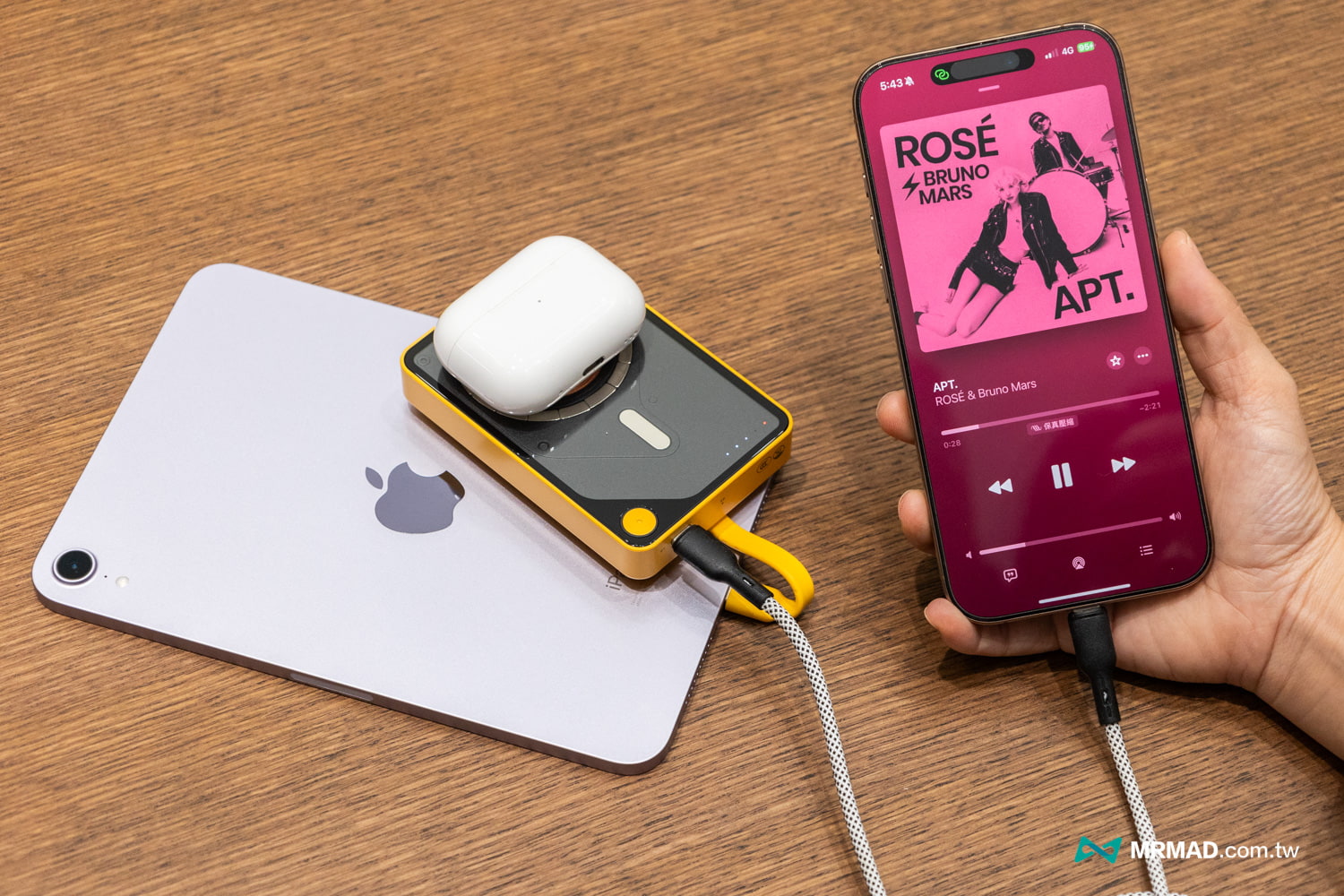 像是可以透過 MagSafe 無線充電替 AirPods 充電,同時使用內建 USB-C 線為手機充電,再透過外接 USB-C 為平板充電,行動電源會智慧分配電力,確保所有裝置都能獲得穩定的充電,就能一次滿足多種裝置的充電需求。(隨機也會附贈 1 米 60w USB Type-C 充電線)