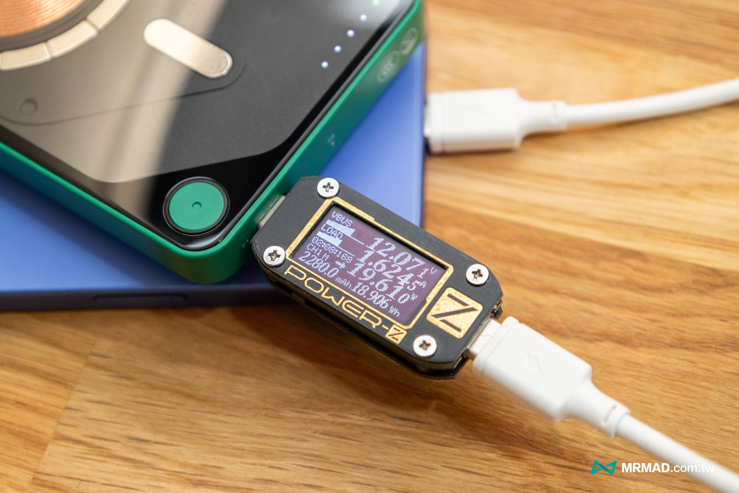 針對 MOMAX 1-Power X Pro 替 iPhone 16 實測輸出功率,要是單獨使用機身本身 USB-C 充電孔,最高能達到19.61W(12.07/1.624A),等同這款能夠滿足 iPhone 有線快充。