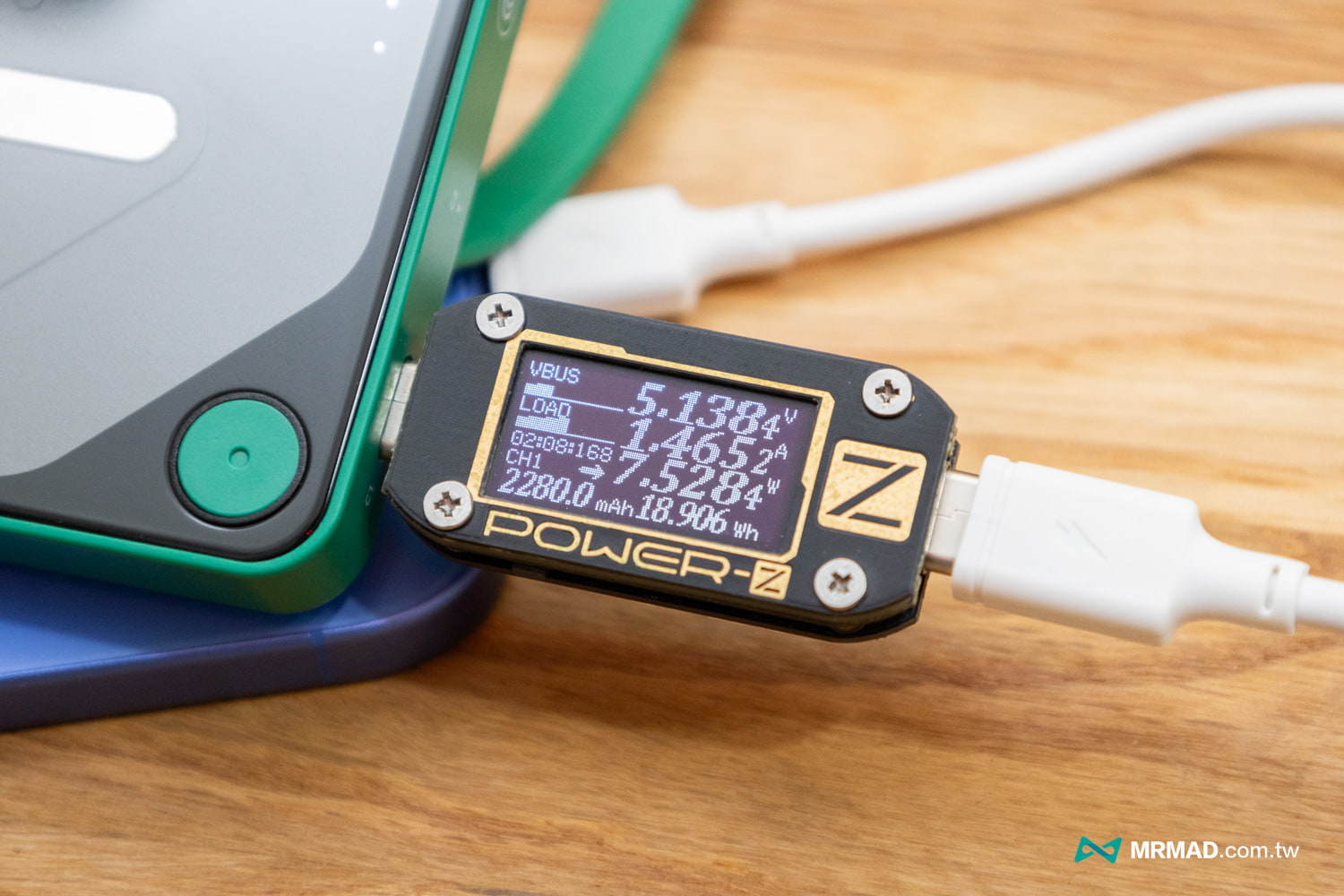 如果是同時替兩台手機充電,電量就會被自動分配,會各自分成 7W~8W 功率輸出。