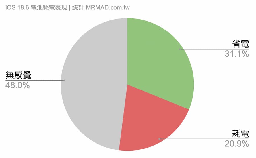從 iOS 18.6 電池續航整體統計資料能發現,大多 iPhone 用戶在升級後,基本上都沒有太大感覺,同樣僅有2成左右用戶才會感覺耗電,相對這次多數 iPhone 用戶在省電比較有感,以 iOS 18.5 來比較從 18.9 % 提升至 31.1% 。