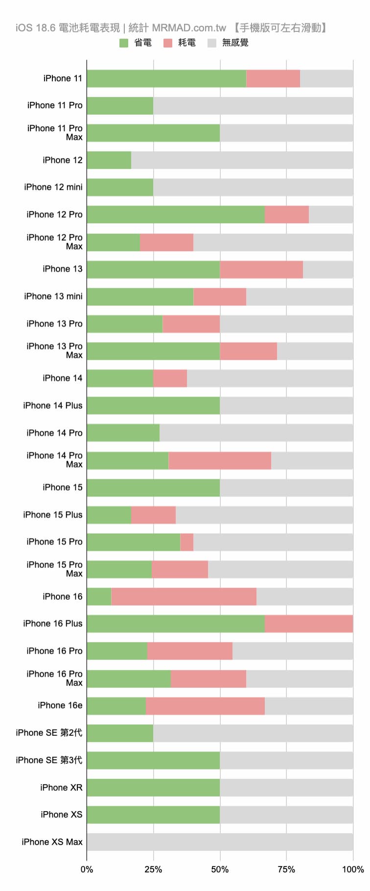 除了針對部分機型實測外,根據《瘋先生》由實際用戶回報的 iOS 18.6 電池續航力數據統計顯示,也能看出整體升級後感受和體驗,從iOS 18.6電池續航統計數據顯示: