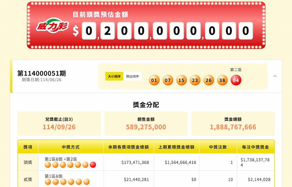威力彩連續34期槓龜,在第114051期終於爆出驚天大獎,開獎結果顯示,一名幸運得主在台中市西區民生路的「期期發彩券行」購買彩券,不僅一舉抱走17.3億元頭獎,更以「包牌」策略意外同步中得7注貳獎,額外進帳1500萬元,總獎金高達17.53億元。