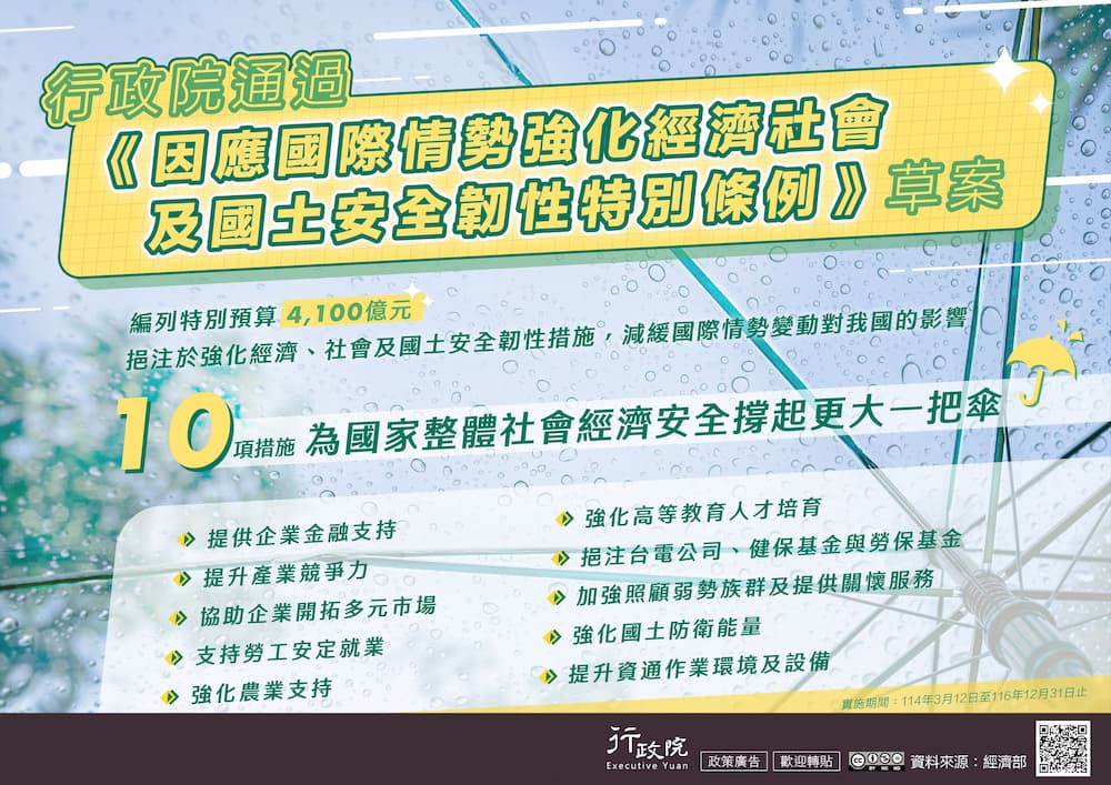 行政院於2025年4月正式提出《因應國際情勢強化經濟社會及國土安全韌性特別條例》草案,規劃編列高達4,100億元的特別預算,以強化台灣經濟、社會與國土安全韌性措施,包括強化社會、經濟、民眾消費與國土安全等細節如下: