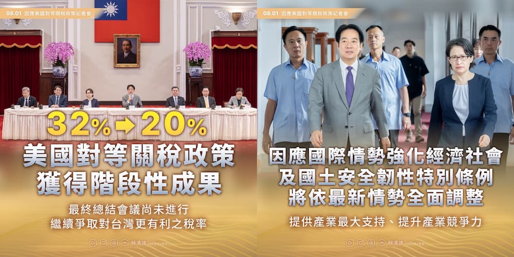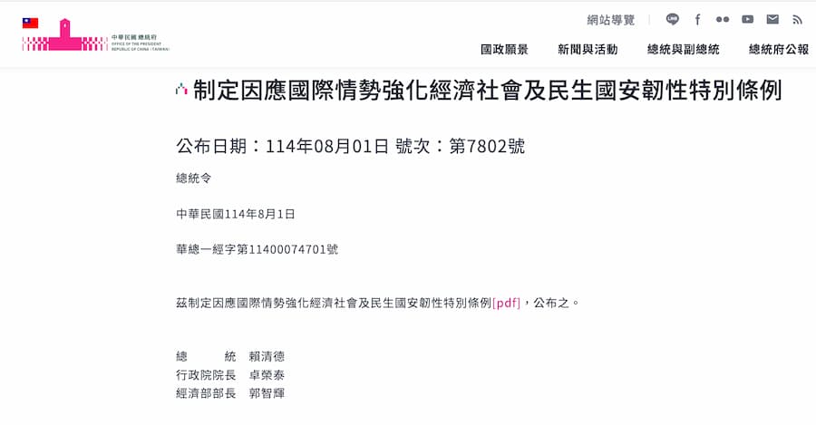 這波政策推動,主要回應美國政府近日公布的高額對等關稅新制,根據美國總統川普關稅公告消息,將針對包括日本、韓國、印尼、緬甸等多國,將自8月1日起多國被美課徵15%至41%高關稅,國際貿易環境驟變,台灣產業與經濟體質勢必要提早備戰。