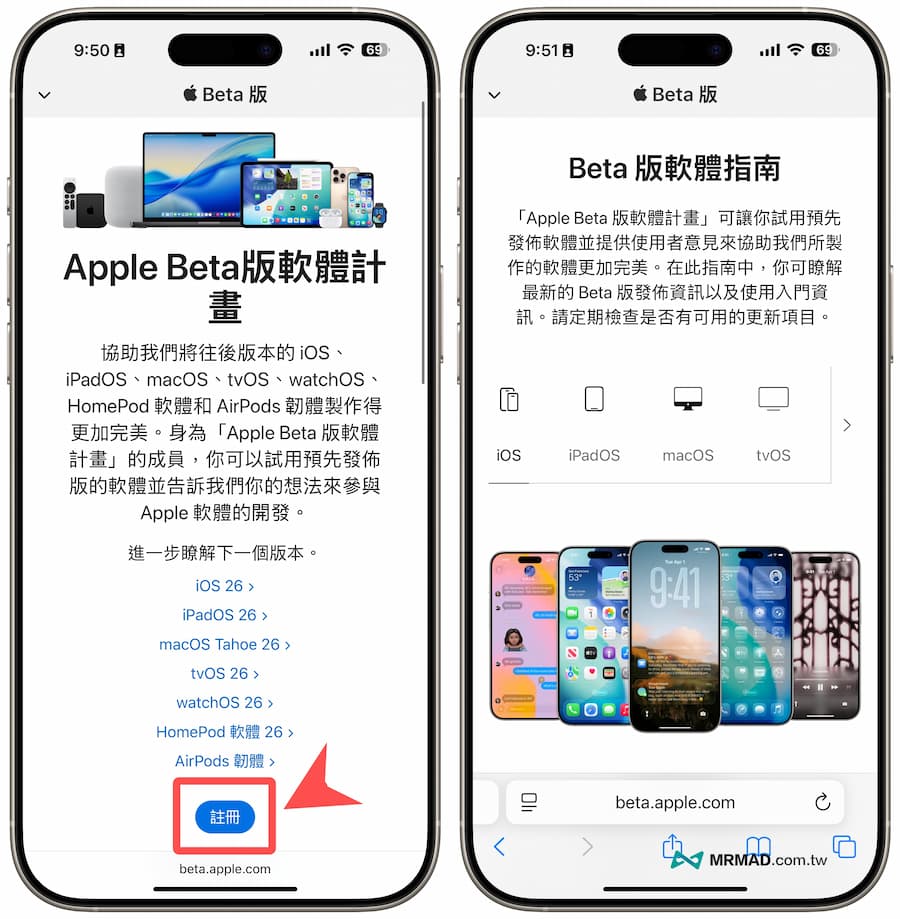 先透過 iPhone 或 iPad 設備開啟 Apple Beta 官網,並且先透過 Apple ID 註冊登入帳號,取得 Beta 測試版資格,並且升級到 iOS 26 Beta 或 iPadOS 26 Beta,底下分享兩個開發者資格和公開測試版申請升級方式: