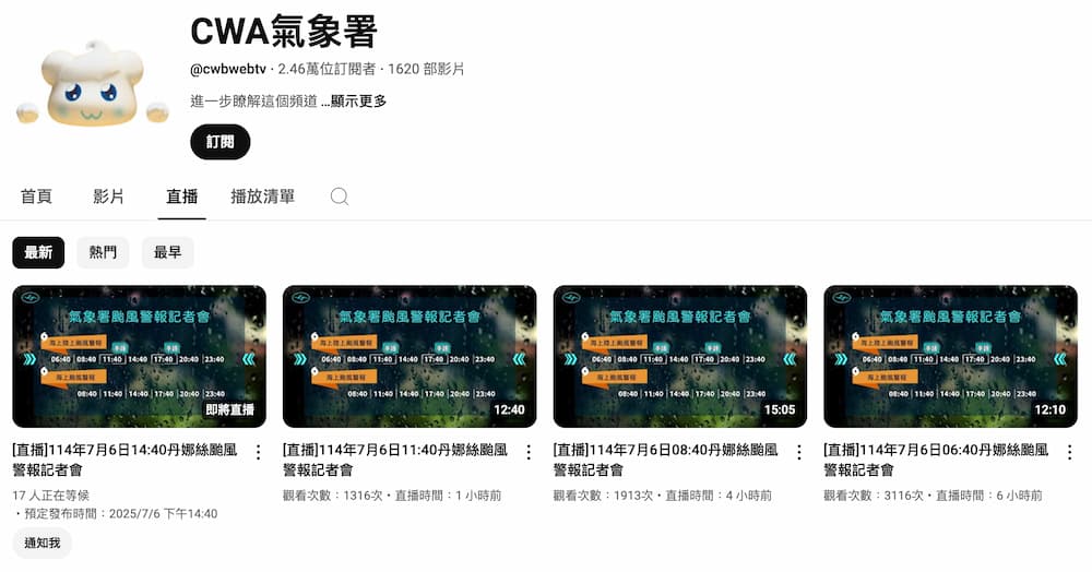 中央氣象署也都會透過 YouTube頻道「CWA氣象署」提供第一手颱風直播消息,通常這都是新聞媒體的消息源頭,如果不想一直追新聞,也可以自己透過氣象署直播查看發布的颱風動態、位置方向、風速、暴風半徑等資訊。