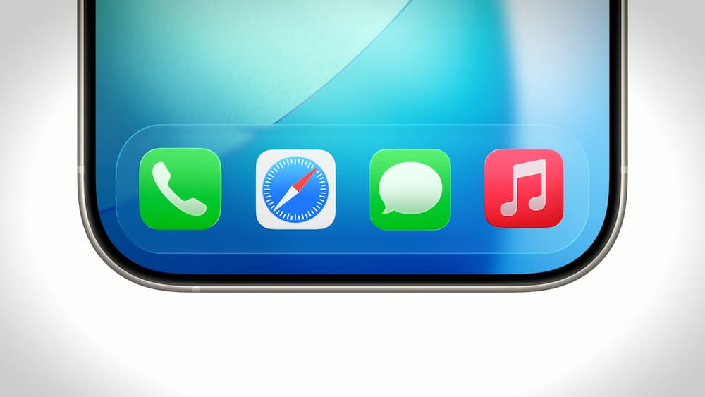 - 主畫面與桌面 Dock、App 圖示、小工具皆採多層 Liquid Glass 呈現,具備動態高光與細膩光影反射。